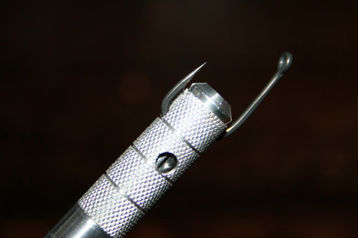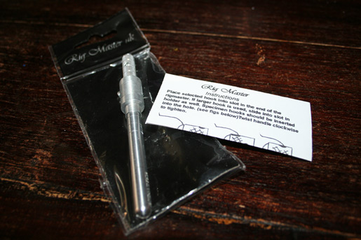 Hoe werkt het. Je pakt een haak en die steek je door het oog op de RigMaster en draait deze voorzichtig vast. Als je haak niet door de oog past kan je hem klemmen in de gleuf boven op, ook door voorzichtig vast te draaien.