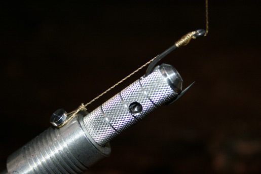 Je knipt eerst een stuk onderlijn materiaal af op de lengte die je normaal gewend bent. Ik gebruik een gecoate versie dus strip een gedeelte. Vervolgens maak je het hair lusje voor je stoppertje. We kunnen nu de lengte van de hair gaan bepalen.