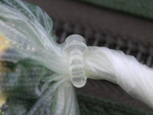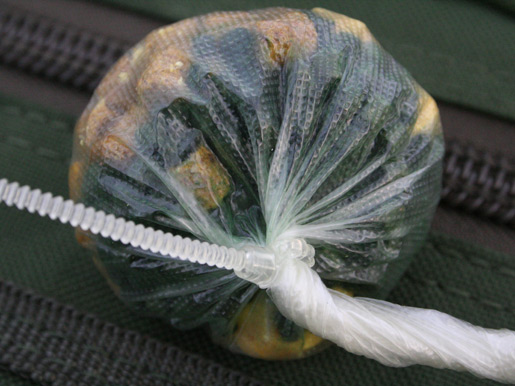 De bedoeling is dat je bijvoorbeeld een pva zakje hebt. Deze vul je met aas en zou je normaal dicht maken met een knoop. Nu gebruik je een Solu-tie. Het is een oplosbare tie-rip. Waar de knoop zou komen, trek je de Solu-tie vast en goed aan. Daar zit het verschil. Nu knip je het overtollige weg je pva is klaar voor gebruik.