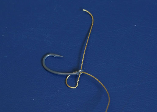 Knip een stuk onderlijn materiaal af van ongeveer 30 a 35 cm. Gebruik je onderlijn materiaal met coating, strip dan ongeveer 10 cm af. Nu pak je de haak en haal je het onderlijn materiaal 2 keer door de oog van de haak.