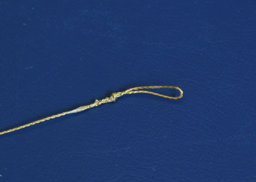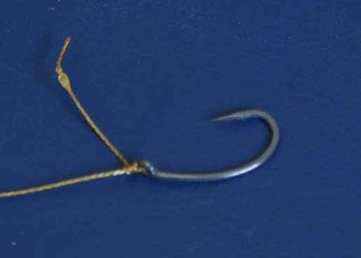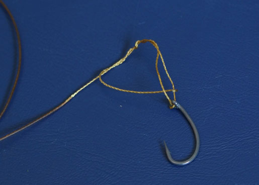Haal de boilie pen door de voorste lust draai dan de lus een keer rond, pak dan de achterste lus en trek die door de voorste. Nu even aantrekken en klaar is de knop. Door de extra draai krijg je een hele sterke knoop.